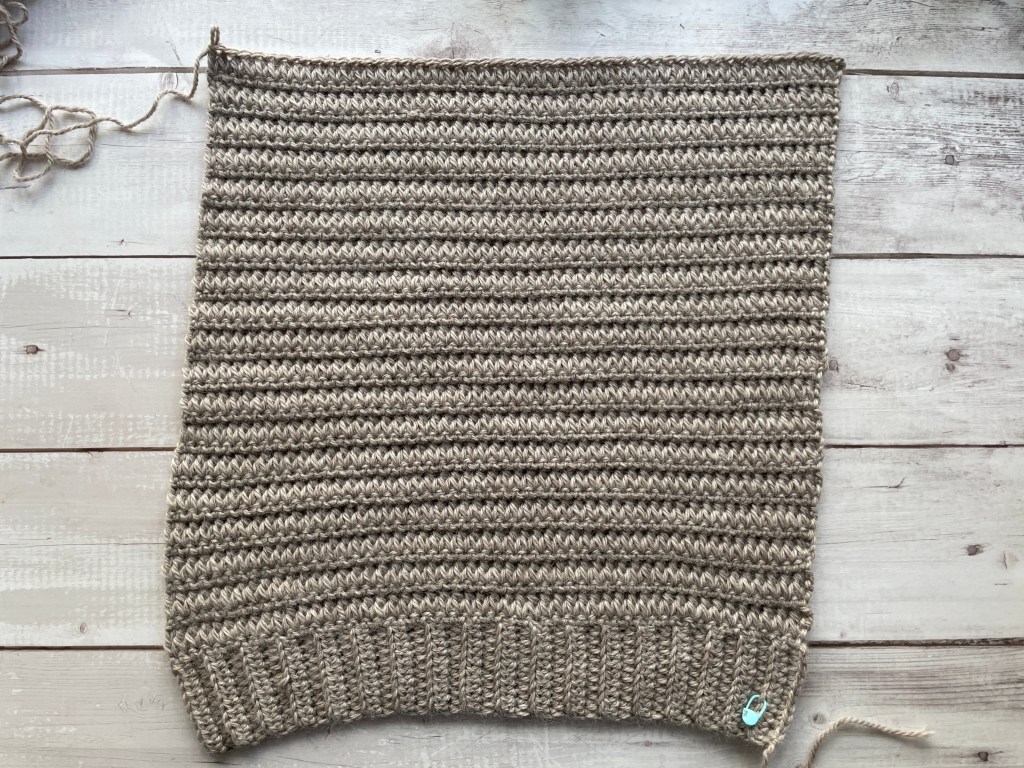 With right side facing, rejoin yarn at the front bottom corner through the BLO of the corner stitch of the ribbed hem, and ch 1