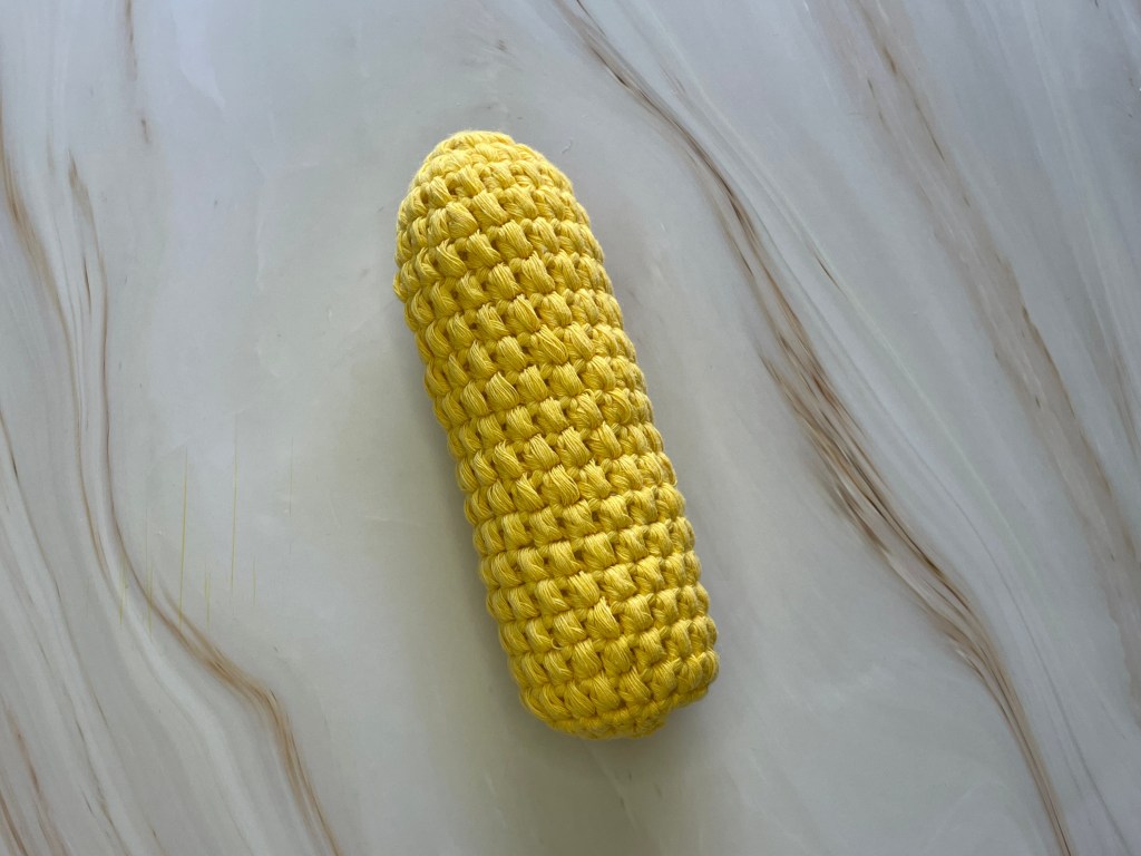 Stuffing: Stuff more than you think you should. Not enough for the stitches to stretch and show holes, but enough to make the toy stiff and able to withstand the rough trials of toy life. The filling will compress a bit over time. I encourage you to use an alternative to poly-fill (unless it’s recycled!). Try using leftover yarn scraps and snippets or old non-donate-able clothes and materials cut into strips. For this corn free crochet pattern, I used recycled polyester stuffing.