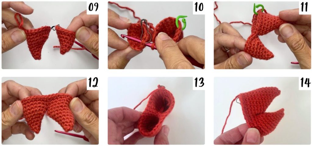 | With the right sides facing out, hold the upper and lower shell together. Insert your hook through both loops of the next stitch on the upper/red shell and the outer loop only of the adjacent stitch on the lower/white shell, complete a sc – PH 03 & 04. Sc through each st around in this same way – using both loops of the red stitches and the outer loop only of the white stitches. Stop before you fully close and stuff firmly. Fasten off and bring yarn to the inside. PH 05, 06, & 07 | ||