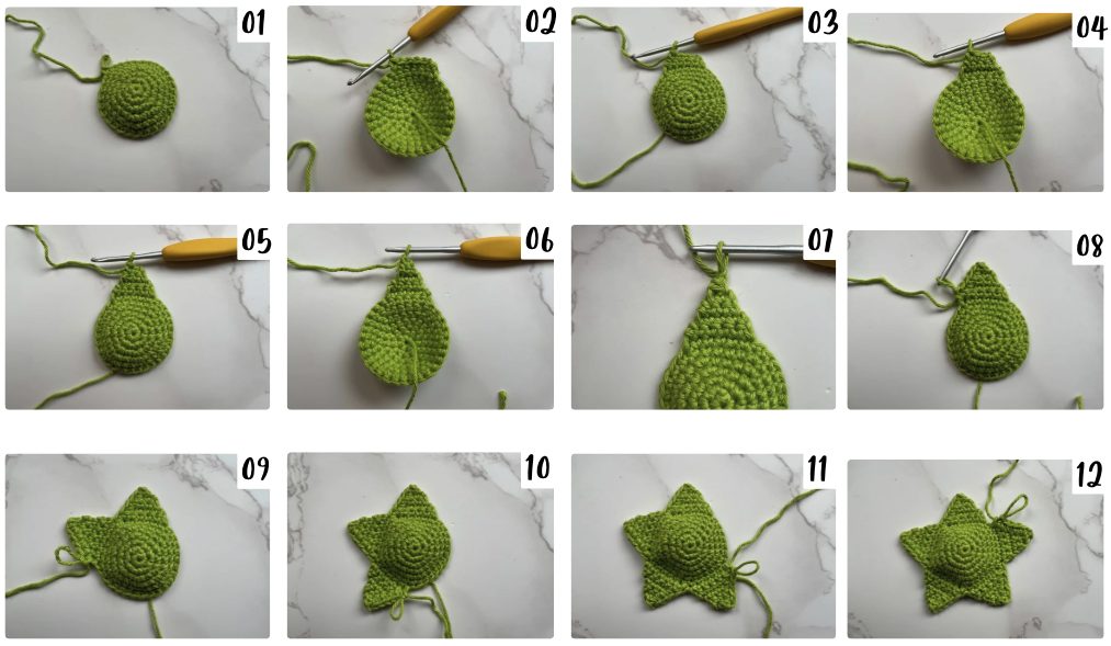 - The leaves begin with continuous rounds for the top part, then switch to turning rows to create the 5 points