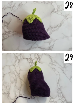 | Fasten off and snip leaving a long tail to sew onto eggplant | ||