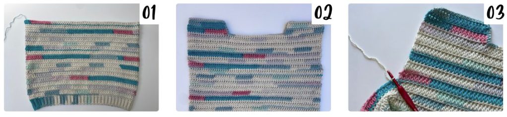 We will split the tube and begin working just one side (half of the number of stitches in the tube rounds) in turning rows to extend the sweater up to the shoulders. We will do this on both sides – front and back – and then seam across the shoulders which will leave a neck opening and arm openings. Your sc rows will always be worked on the WS and your FC rows will always be worked on the RS.