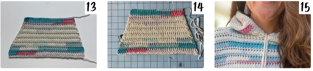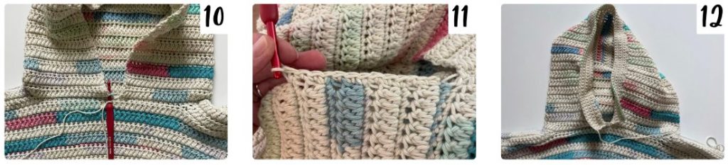 - The hood is crocheted directly onto the neck opening using turning rows with our normal 2-row repeat. It is then seamed closed across the top. After that, we come back and add the extension to house the drawstring.