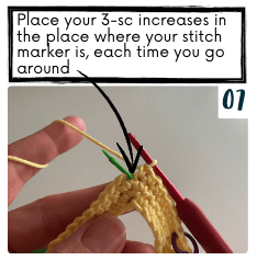 - Always mark the first st of the round – you will remove and replace it again as you follow the instructions below.