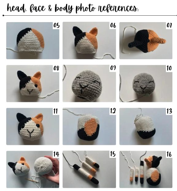 - For the calico cat color, the two legs have different color schemes – the colors for each of the rounds can be found below, after the method.