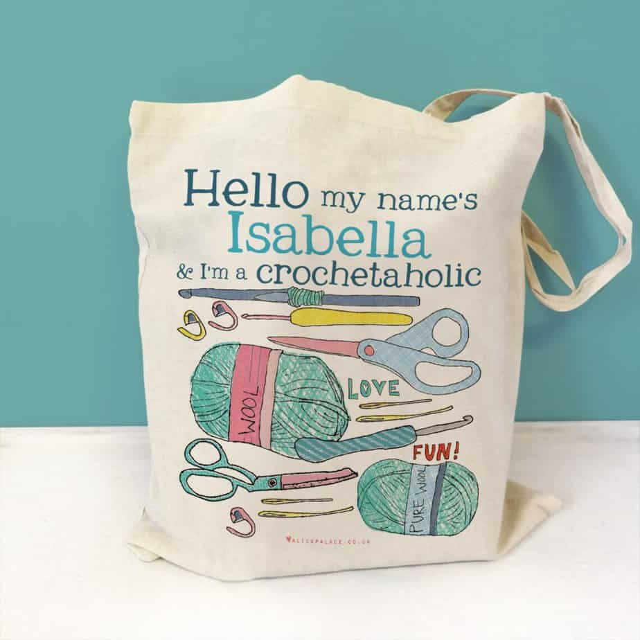 This personalized project bag is adorable + hilarious. Make their mobile-making fun! Your crochet-lover will LOVE carrying their projects in public with this eye-catching personalized tote.