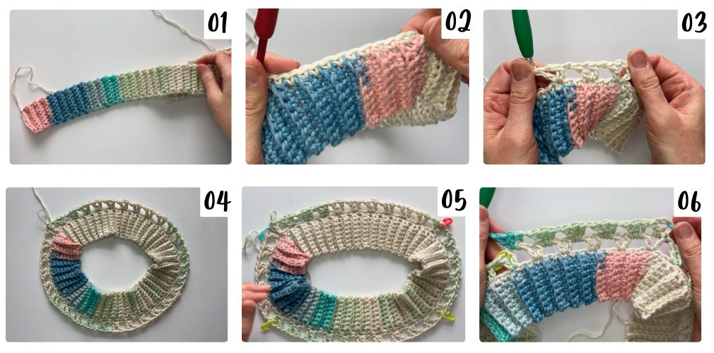 - The collar is worked in turning rows – ch 1 and turn after every row (ch-1 doesn’t count as a st)