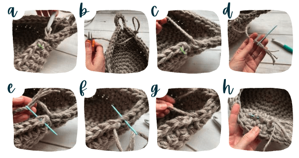 - INVISIBLE FASTEN INSTRUCTIONS – refer to photos A through G below: Take your hook off the loop (A). Leaving a long tail, snip the yarn (B) and pull it through the loops of your final stitch (C). Then, thread the yarn end onto a tapestry needle (D). Insert the needle from inside to outside (back to front) under both loops of next stitch (E) and pull yarn tail through, then bring the yarn back under the BLO of the previous stitch (F) and pull to the inside of the basket, pull tightly (G). Tie off and weave in on the inside of the basket (H).