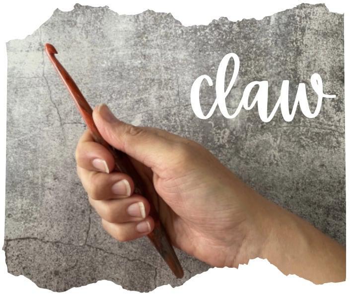Saber Grip: This hold leads with the thumb, similar to how you might hold a sword. The other four fingers curl around and grip the hook while the handle rests inside the palm. This hold requires more wrist work (usually side-to-side) than finger work so if you have trouble with pain, this might not be the one for you.