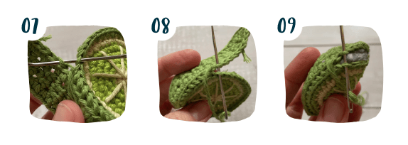 Fasten off, leaving a long tail for sewing the slice to the peel. Using a tapestry needle and the long tail, join the peel with the slice to create a wedge. Pass the needle from front to back (right side to wrong side) through the back loop of the last round on the slice, and from back to front (wrong side to right side), through the back loop on the peel. PH 07-09 Repeat all the way around for all 42 stitches, stuffing and shaping the wedge before you sew it all the way closed. Bring the yarn to the inside and snip.