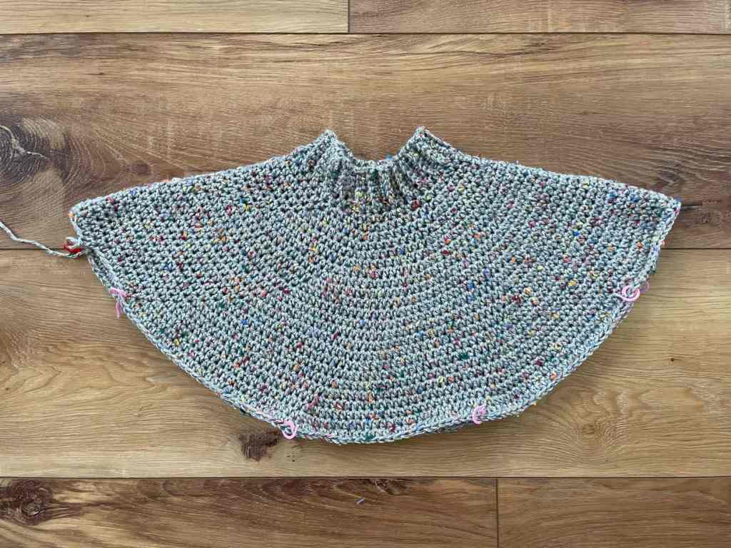 Lay the yoke out flat. You will now count stitches to split for the sleeves. Make sure where you left off on the yoke is at the armpit of one of the sleeves. For each sleeve, count 48(48, 52, 52, 56)(56, 60, 60, 62) stitches around for each sleeve opening and mark with a stitch marker.