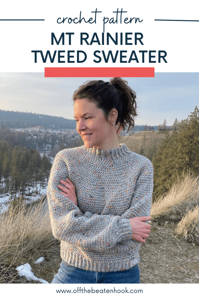 This crochet pullover sweater pattern is reader supported by ads on my blog. You can find the full, printable, ad-free pattern of the Mt Rainier Tweed Sweater with lots of helpful pictures and additional tips in my shop here!