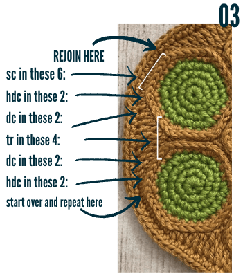 The tummy is crocheted in continuous rounds using the color Gooseberry. Do not join at the end of each round.