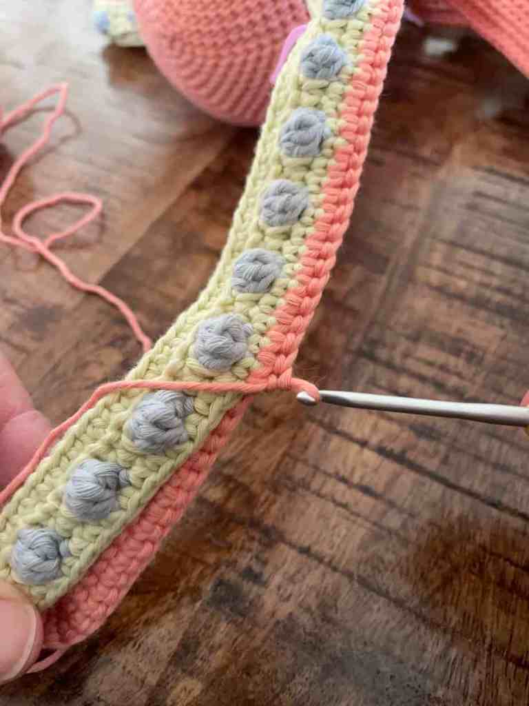 - The bobble stitches use color C, so remember to change colors appropriately right before that stitch and changing back to color B immediately after. Take a quick reminder on how to properly change colors if needed before you begin.