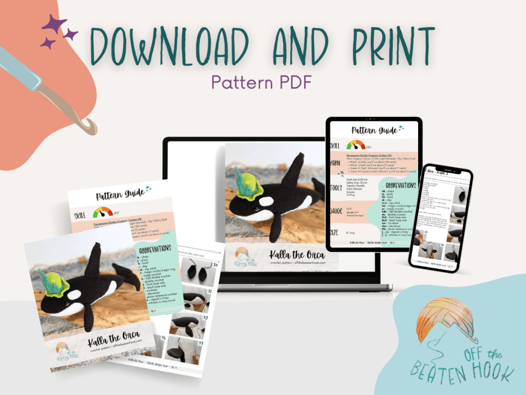 This crochet orca pattern is for PERSONAL USE ONLY. This pattern or parts of it may not be reproduced, resold, distributed, published, altered, translated, posted or shared without authorization. You can sell your finished items provided that you credit Off the Beaten Hook as the designer using this verbiage, “This pattern was designed by Lindsey Roe and Off the Beaten Hook.” Thank you for your respectfulness!