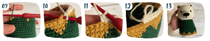 - The hood uses the green colored yarn (or whatever color you used for the sweater)